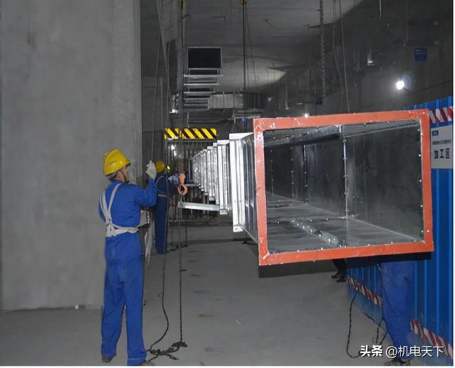 风管组装长度不超过10米,避免风管吊装变形。吊装点设置合理、牢固,不少于4个,倒链性能安全可靠。整体吊装时,两端速度应同步。