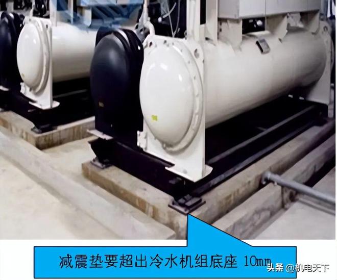 机组安装减震垫必须采用优质、整块减震垫,减震垫尺寸大于冷机垫铁尺寸,减震垫超出冷水机组底座10mm