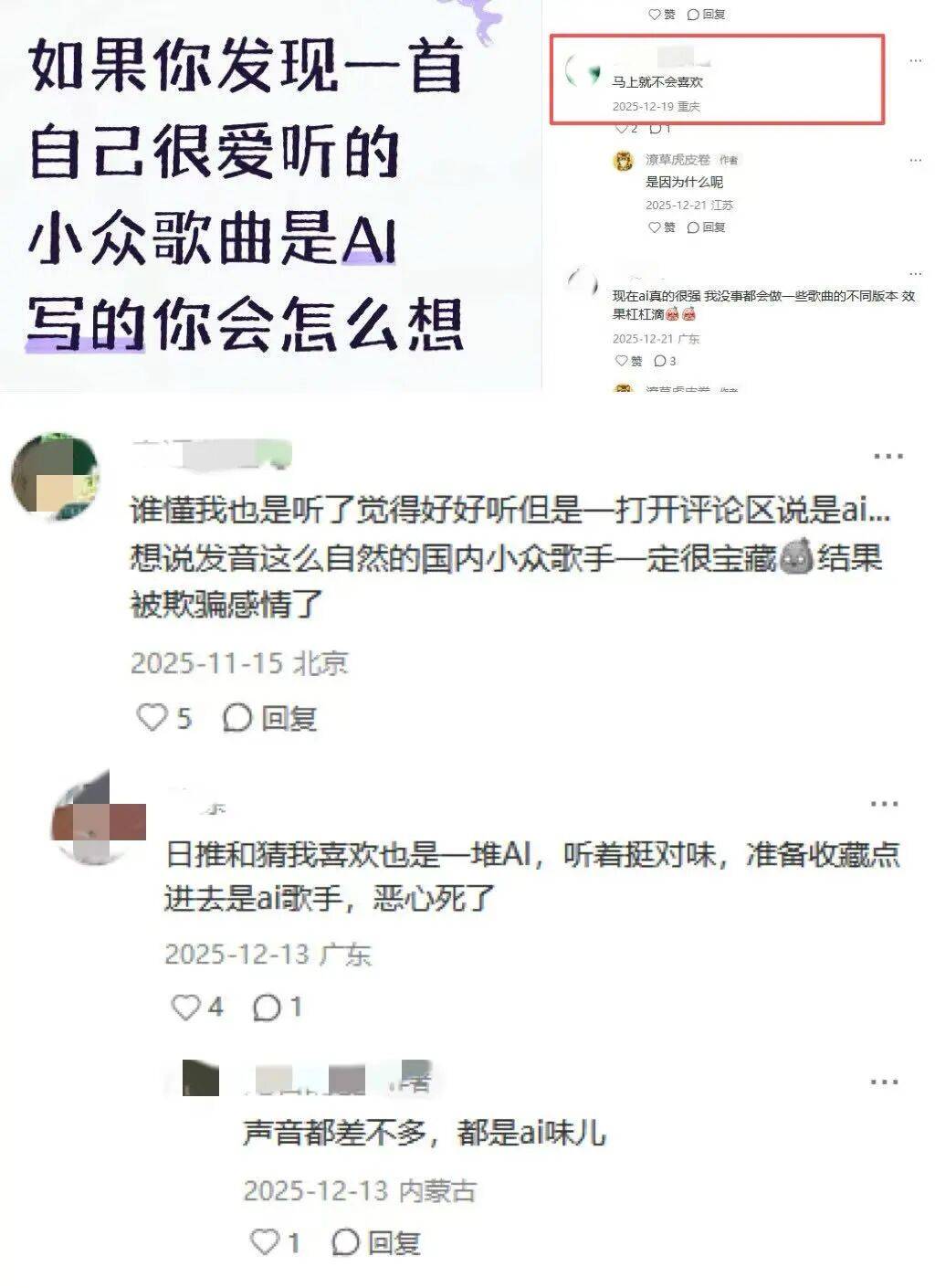 第一类听众,最典型的反应是,刚听觉得还行,一知道是AI,立刻下头,好感瞬间坍塌。