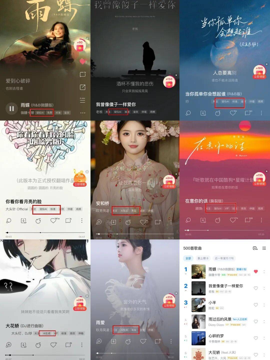 各大平台排行榜上,会发现前列歌曲密集出现“AI”或“疑似AI”的标签,比如排名靠前的《雨蝶》(R&B微醺版)、《我曾像傻子一样爱你》,以及第11位的《你看你看月亮的脸》,几乎都被平台标注是AI重制或生成内容。