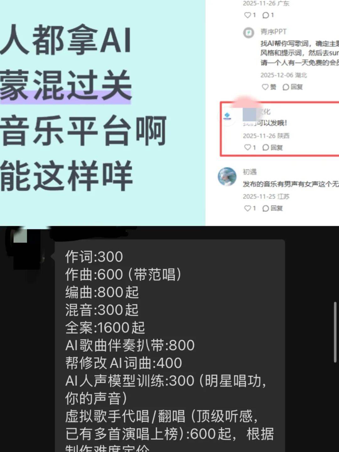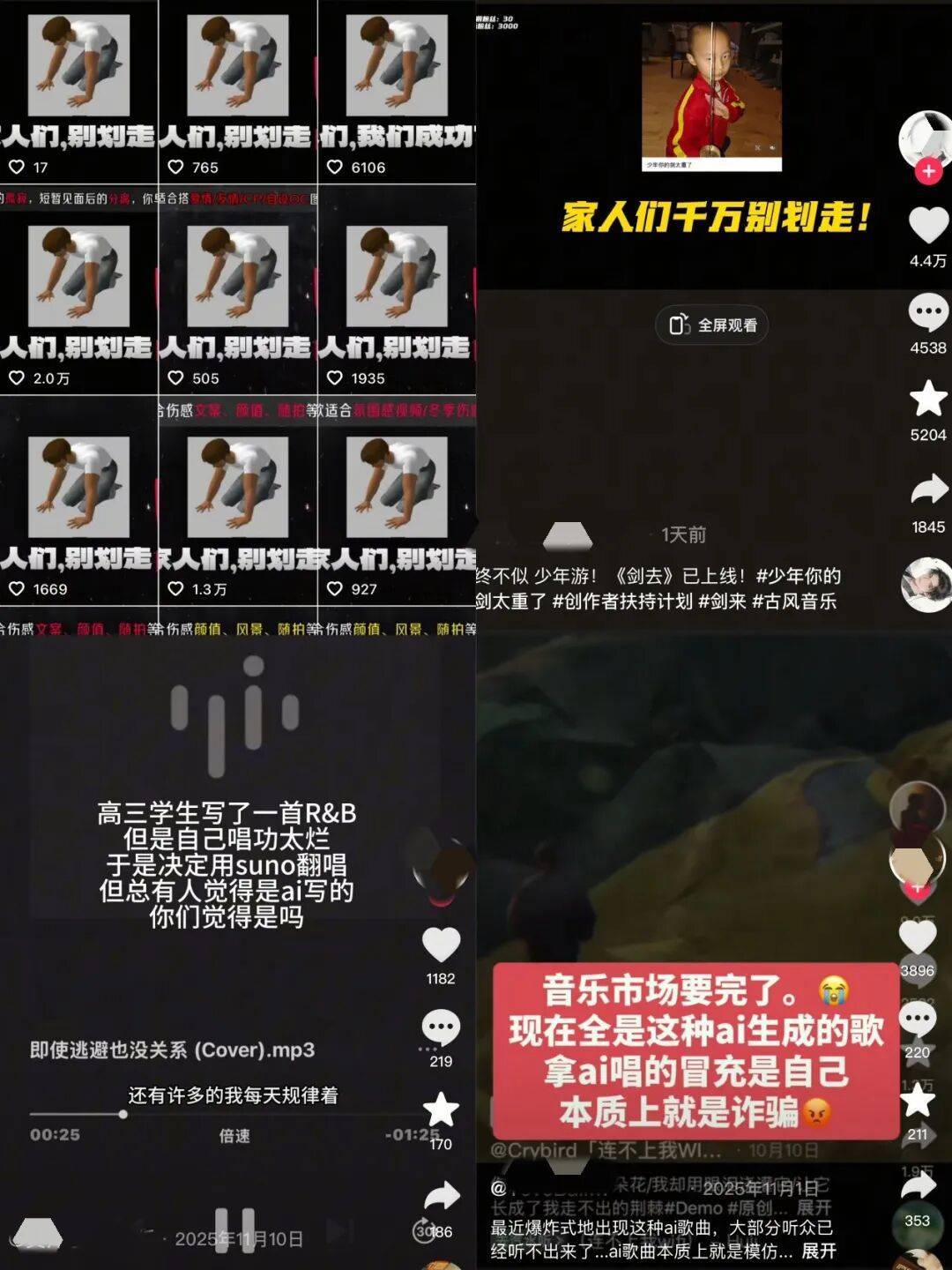 从评论区看,不少用户都被蒙在鼓里以为账号背后的,真的是一个熬夜写歌、反复修改、怀揣音乐梦想的草根宝藏音乐人。却很少意识到,那些看似“真诚”的作品,往往只是算法与模板批量生成的结果,为的只是骗取流量,起号变现。