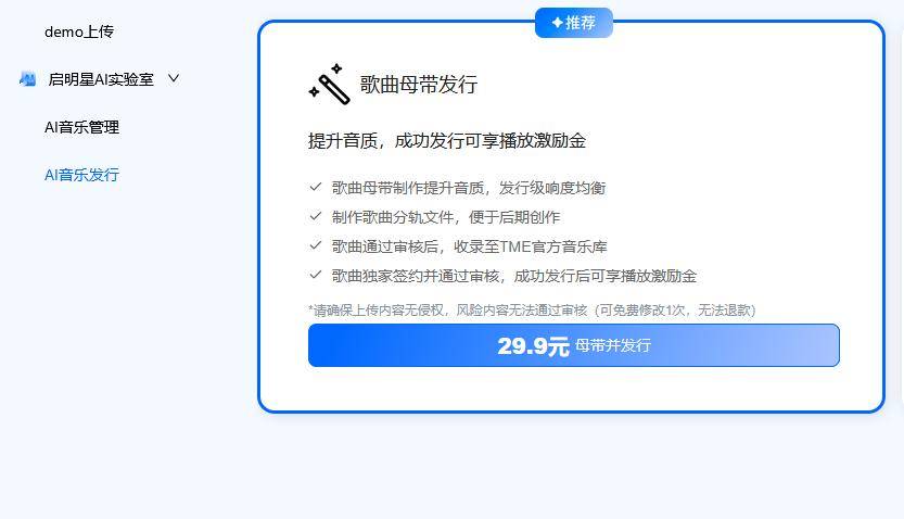 更关键的是,AI音乐还正式被纳入了发行体系。以“启明星”为例,平台逐步开放了AI内容的创作与分发入口,无论使用的是自研模型,还是Suno等第三方工具生成的作品,只需支付29.9元母带费用,就可以在TME独家发行,并参与激励金分成。
