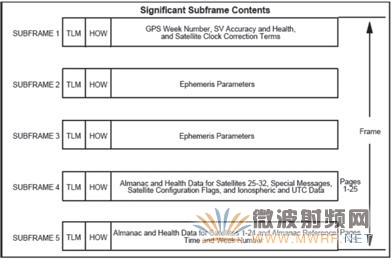 GPS 信号分为 5 种不同的子帧,每个子帧时间长度为 6 秒钟,发送 300 比特有效数据,比特率为 50 bps,经